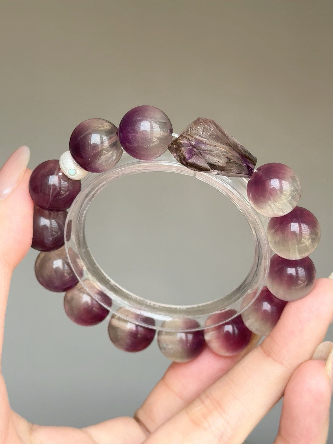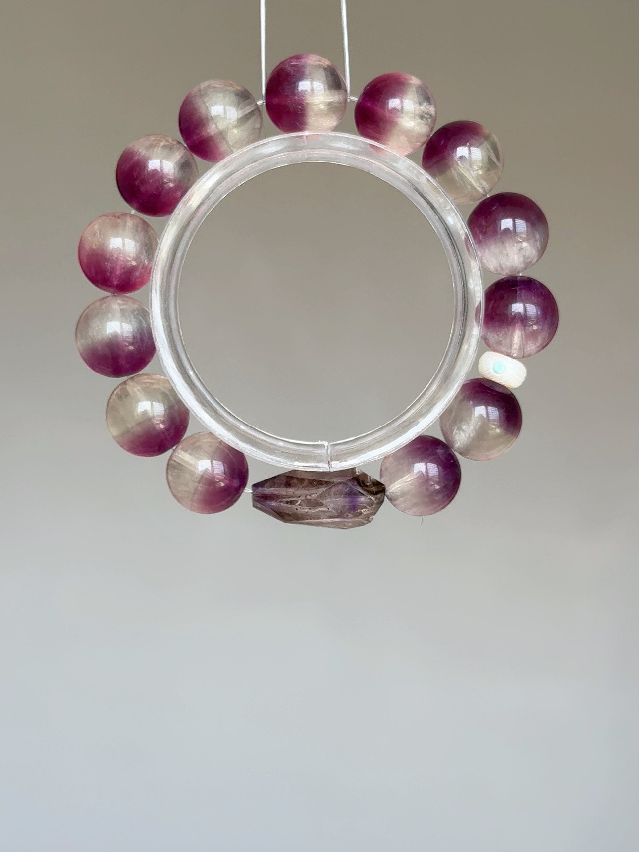 ☪ 規格 Specs: 半盆拉絲紫螢石(13m)、雙色超七手工磨隨型(15.3×21.6×15.9m)、珍珠鑲嵌綠松隔珠