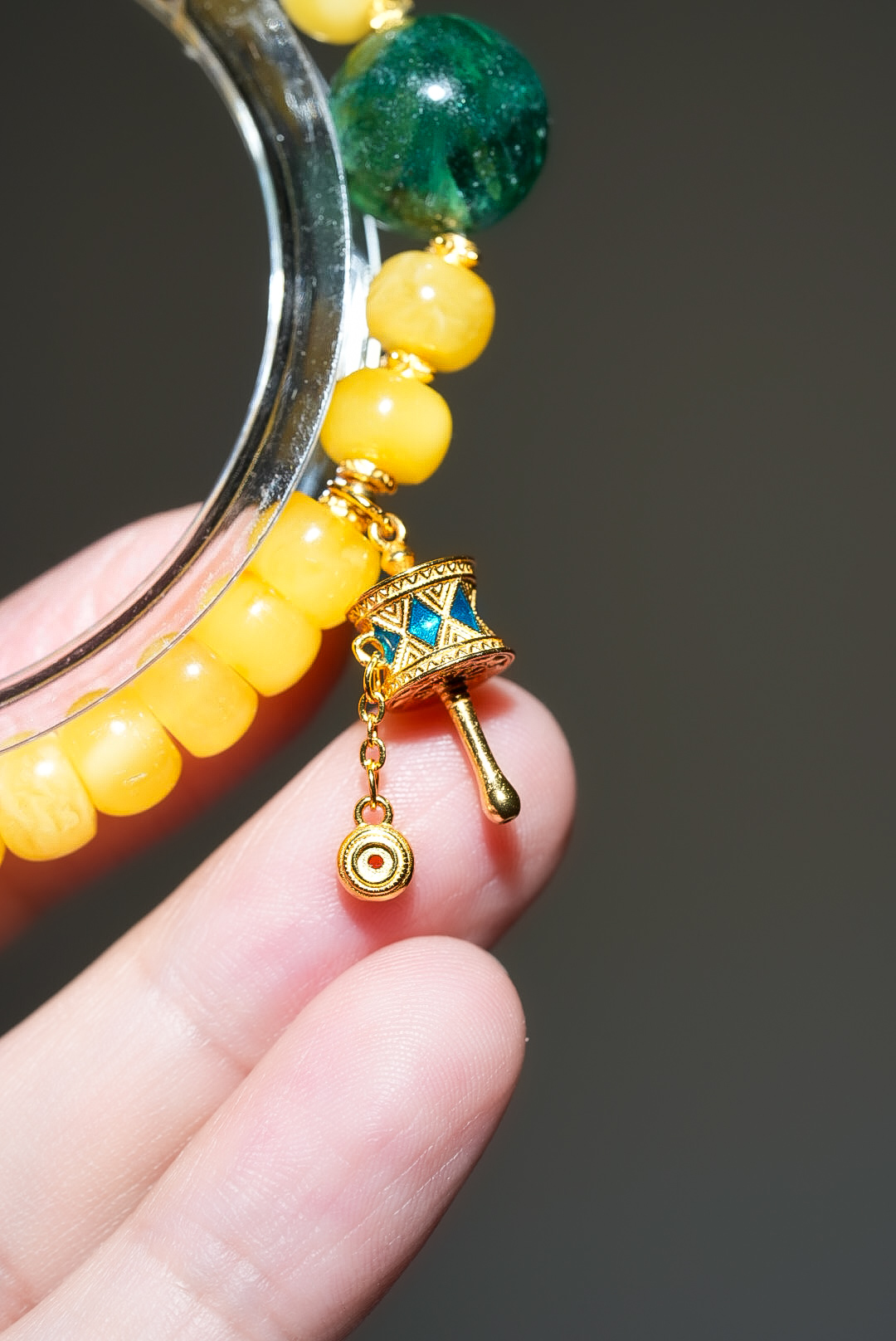 ☪ 規格 Specs: 百花滿密蜜蠟+綠祖母晶+純銀包金轉經輪配件