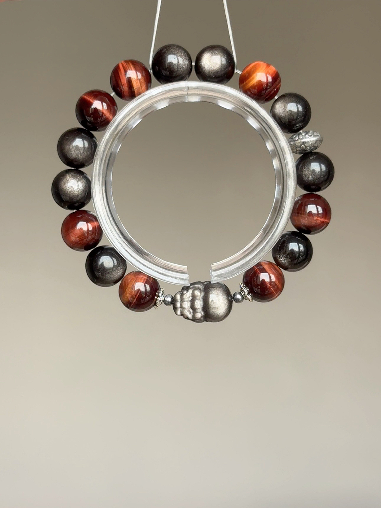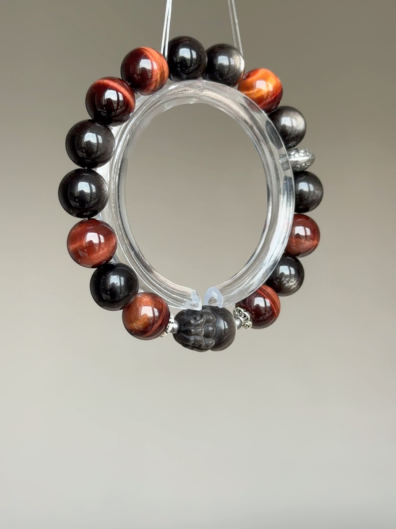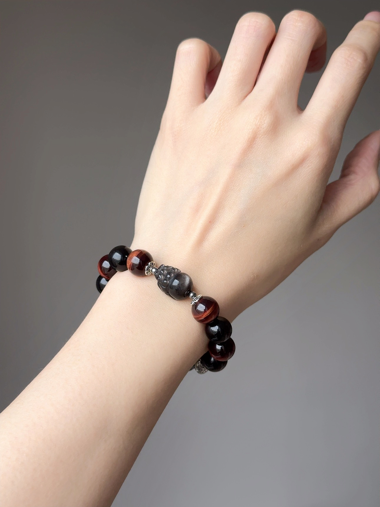 銀曜石在光線下閃爍著銳利的銀沙光芒, 祂是你隨身的「隱形神盾」,專門吸收並反彈那些試圖消耗你的負能量、嫉妒與閒言閒語, 幫你在複雜的人際關係中,保持絕對的清醒與理智。 而深沉閃耀的紅虎眼石,則直接對應你的海底輪。 當你覺得疲憊、失去動力時,祂能像烈火般點燃你的生命力與熱情, 驅散所有的優柔寡斷,賦予你雷厲風行的執行力。「銀曜神獸貔貅」是這座江山的終極鎮守者。 用最強的辟邪材質,雕刻成最守財的神獸。 祂不僅為你鎮守財庫、擋掉一切破財的厄運, 更會利用紅虎眼為你開拓的道路,以雷霆之勢精準咬下最豐厚的大筆訂單與正偏財。