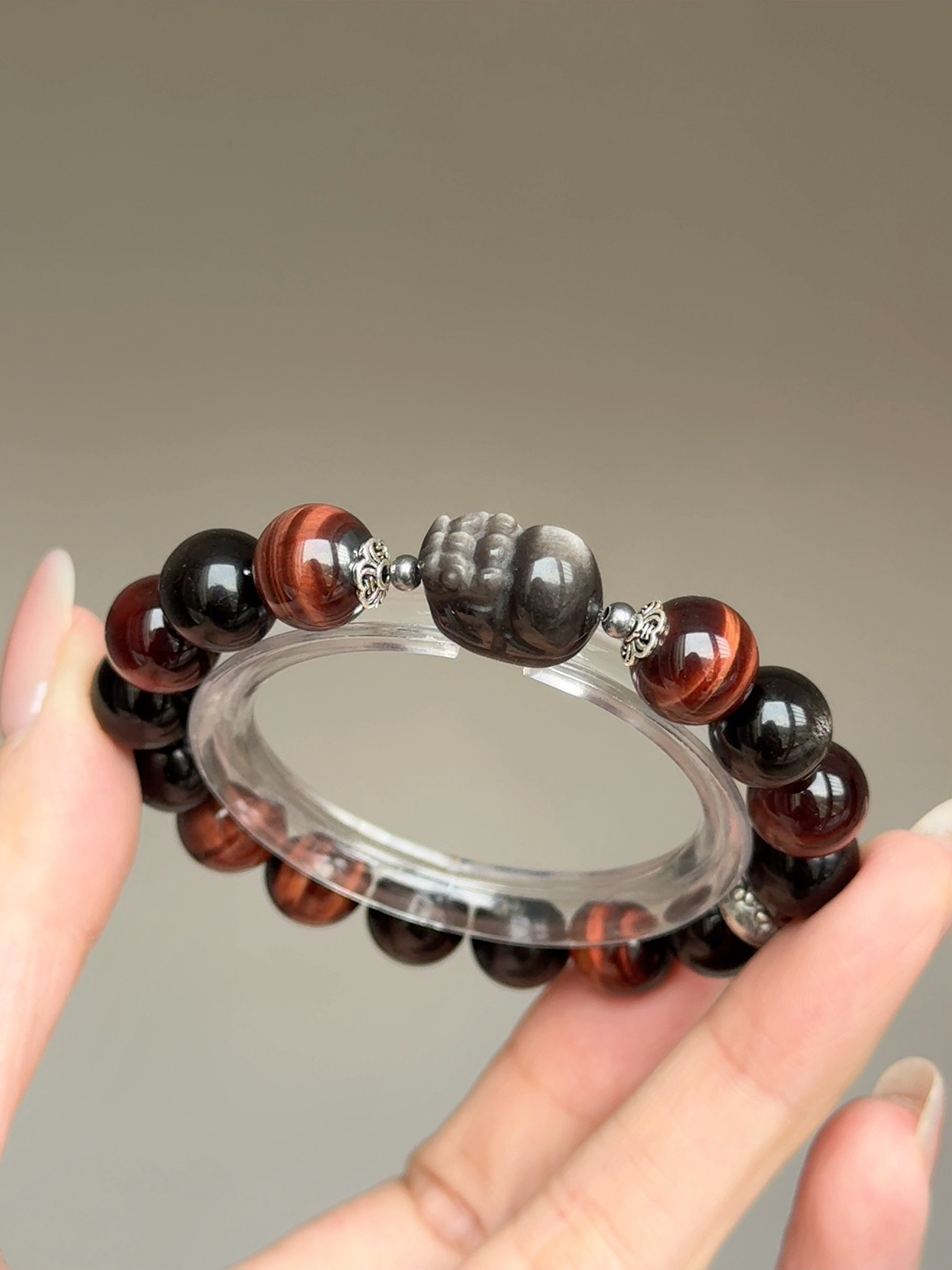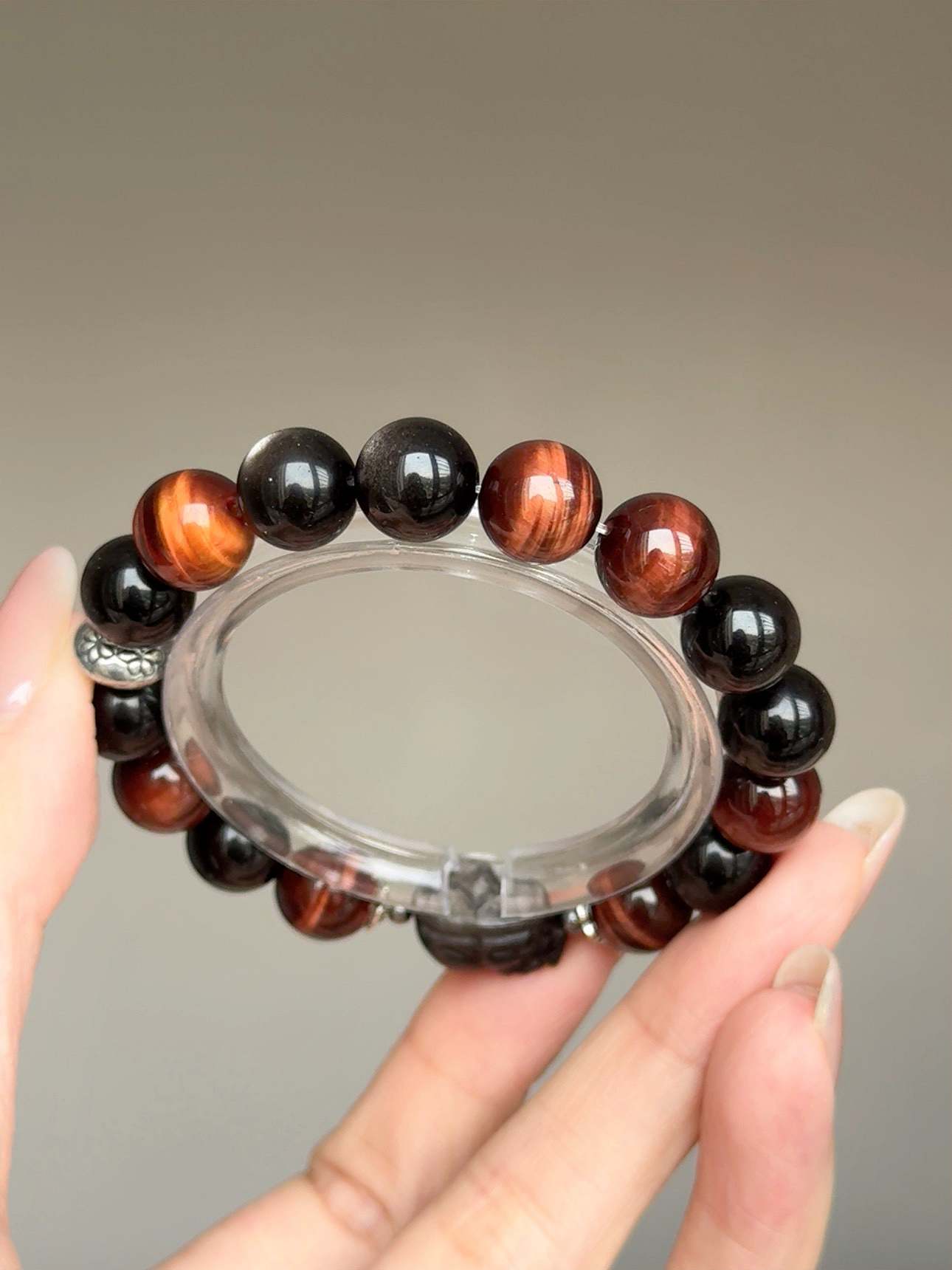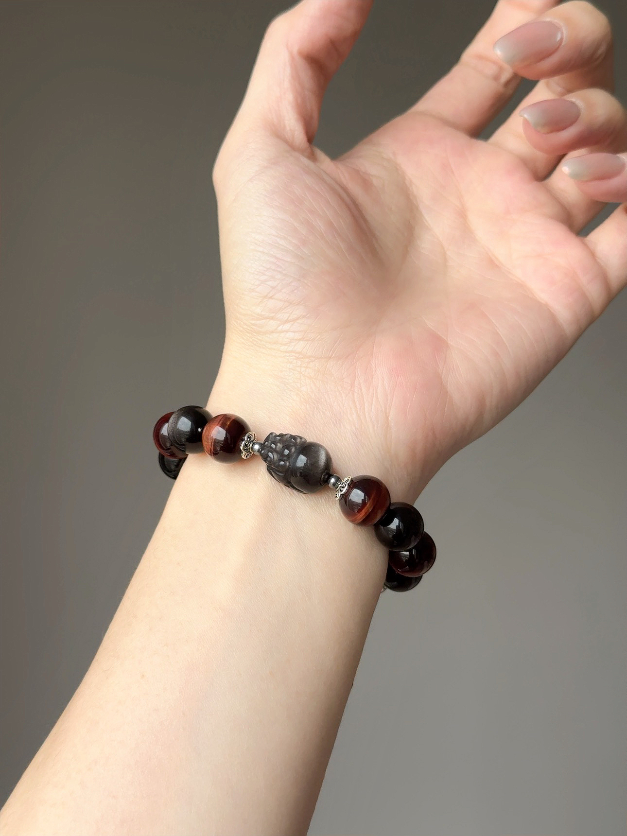 銀曜石在光線下閃爍著銳利的銀沙光芒, 祂是你隨身的「隱形神盾」,專門吸收並反彈那些試圖消耗你的負能量、嫉妒與閒言閒語, 幫你在複雜的人際關係中,保持絕對的清醒與理智。 而深沉閃耀的紅虎眼石,則直接對應你的海底輪。 當你覺得疲憊、失去動力時,祂能像烈火般點燃你的生命力與熱情, 驅散所有的優柔寡斷,賦予你雷厲風行的執行力。「銀曜神獸貔貅」是這座江山的終極鎮守者。 用最強的辟邪材質,雕刻成最守財的神獸。 祂不僅為你鎮守財庫、擋掉一切破財的厄運, 更會利用紅虎眼為你開拓的道路,以雷霆之勢精準咬下最豐厚的大筆訂單與正偏財。