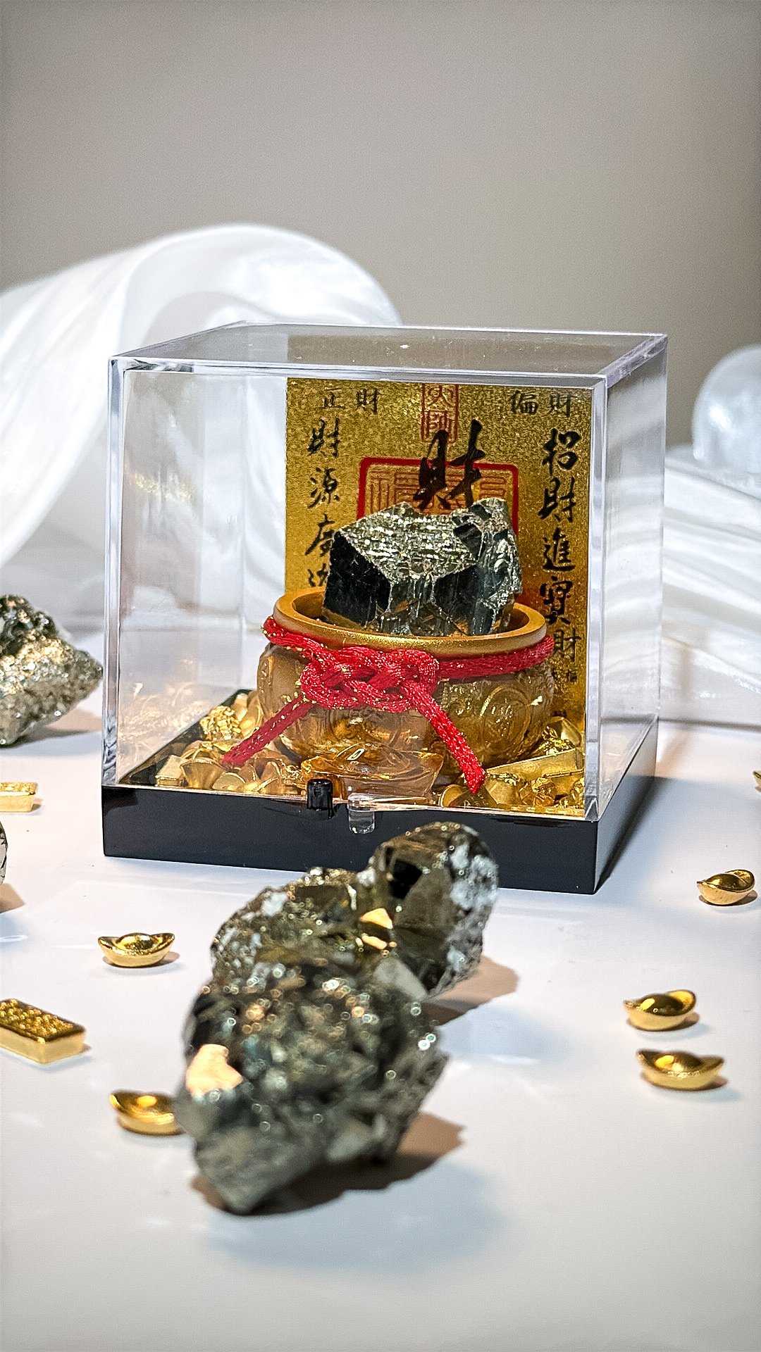 ▌ 聚寶盆|能量的容器 「氣」需要被聚集,才不會消散。 這個金色的容器象徵著 「財庫」。它將黃鐵礦發散出的強大能量,以及紫幽靈吸引來的貴人運,通通收納其中,形成一個 「只進不出」 的聚氣場,幫你守住辛苦打拼來的成果。