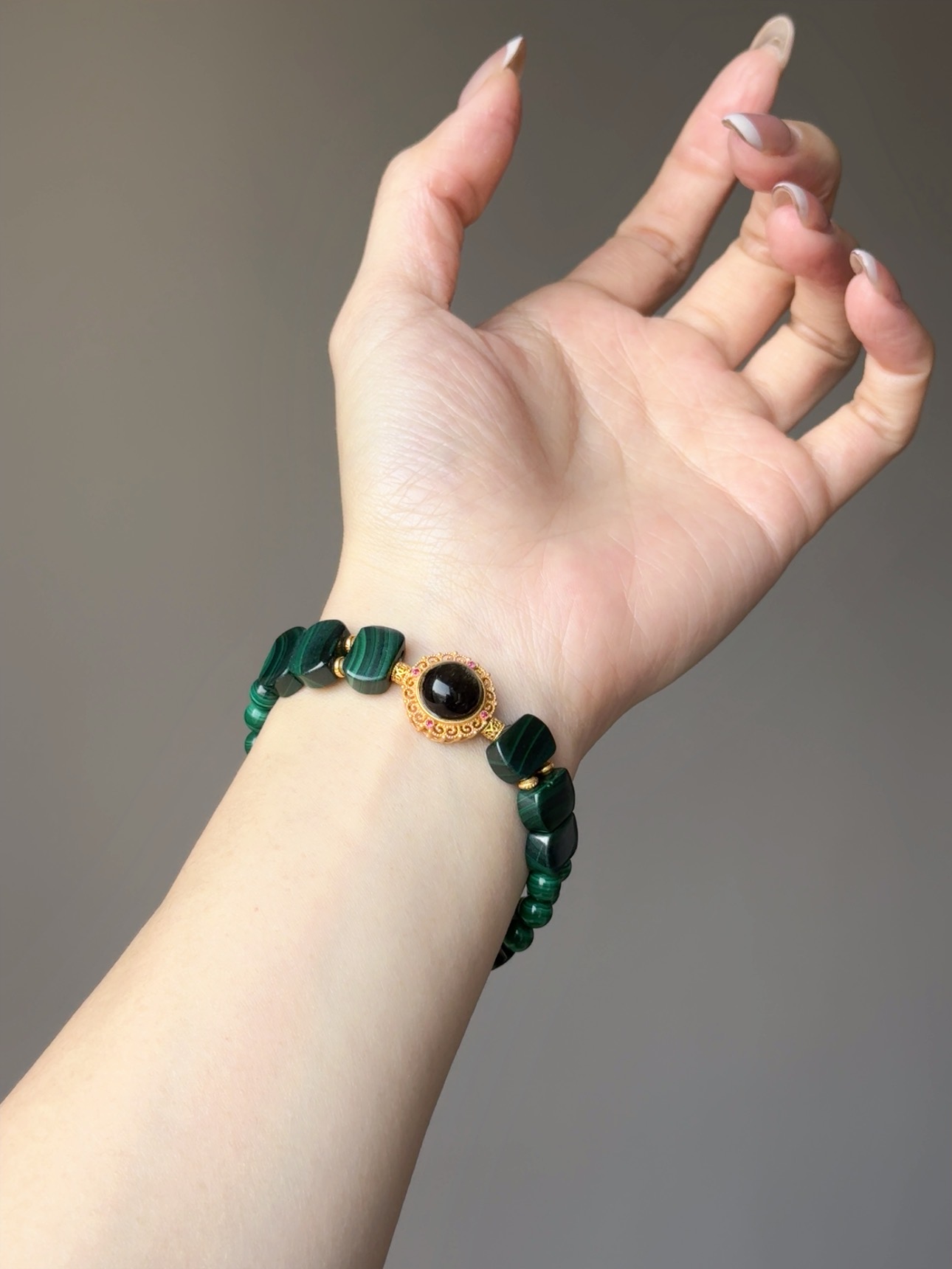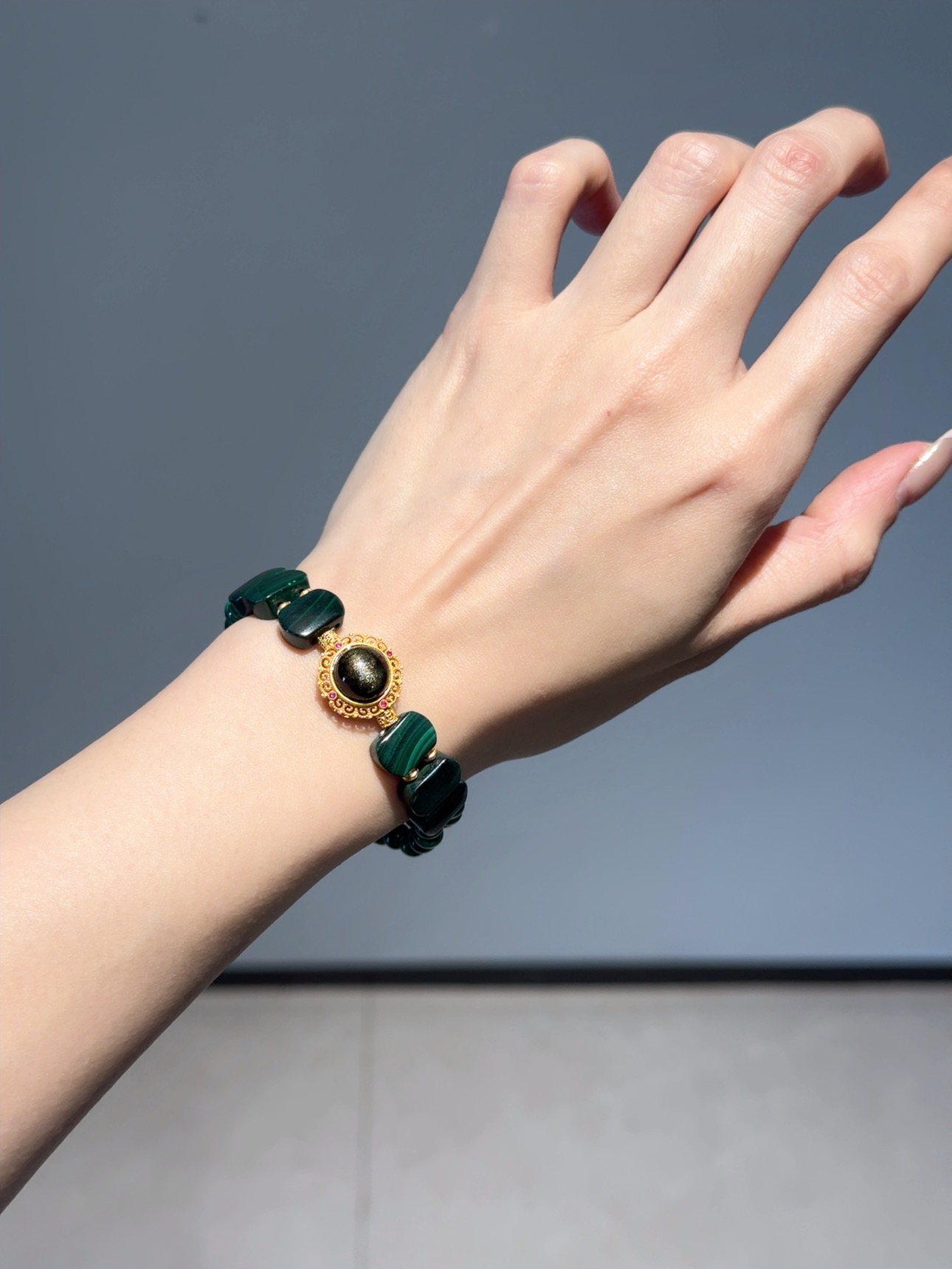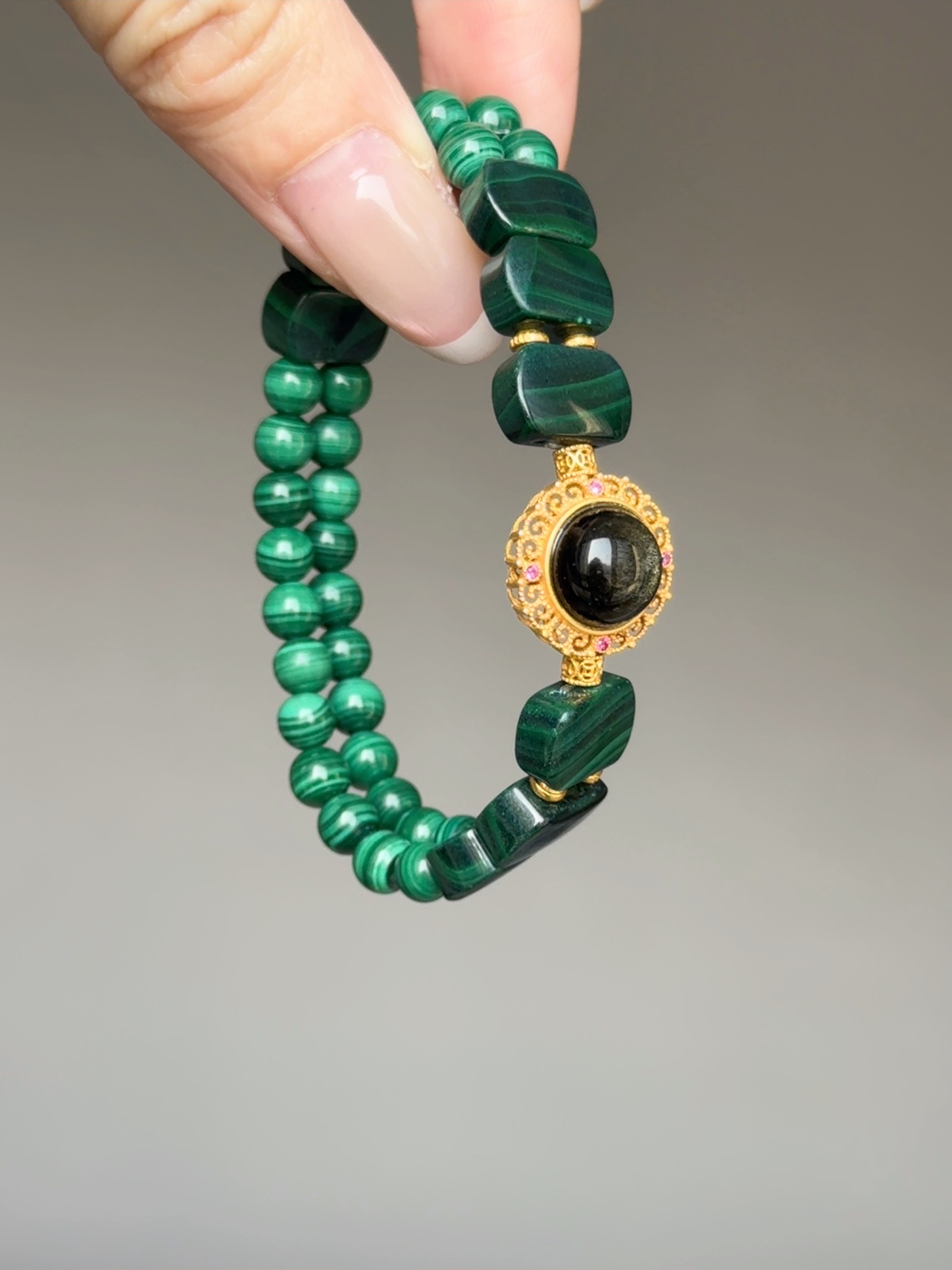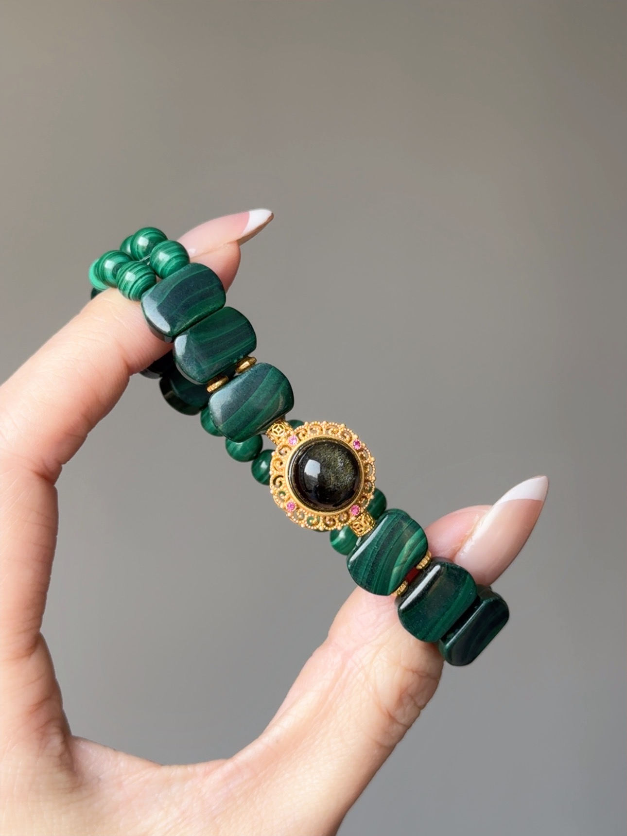 Rosa.G 獻給「準備破繭而出」的妳,一份最具野心的禮物。 我們將「孔雀石」,與深沉內斂的 「金曜石」 結合。 這不僅僅是視覺上「高貴綠」與「神秘黑」的頂級藝術撞色, 更是能量學上最完美的 「攻防一體」。